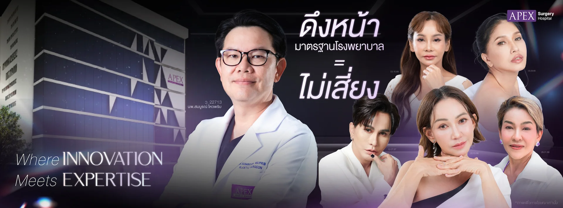 โรงพยาบาลศัลยกรรมที่ให้บริการด้านศัลยกรรมแบบครบวงจรที่มีชื่อเสียงทั้งในประเทศไทยและระดับนานาชาติ ก่อตั้งโดย พญ. นันทภัทร์ สุภาพรรณชาติ ผู้เชี่ยวชาญด้านผิวหนังและความงามที่มีประสบการณ์และความรู้เฉพาะทางอย่างลึกซึ้ง โรงพยาบาลศัลยกรรมตกแต่งเอเพ็กซ์ (APEX) มีความโดดเด่นในการนำเทคโนโลยีทางการแพทย์ที่ทันสมัยมาใช้ในการผ่าตัดศัลยกรรม เพื่อตอบโจทย์ความต้องการของผู้ที่ต้องการเปลี่ยนแปลงรูปร่างและใบหน้าให้ดูดี รวมไปถึงแก้ปัญหาต่าง ๆ ด้วยการทำศัลยกรรมตกแต่งความงาม