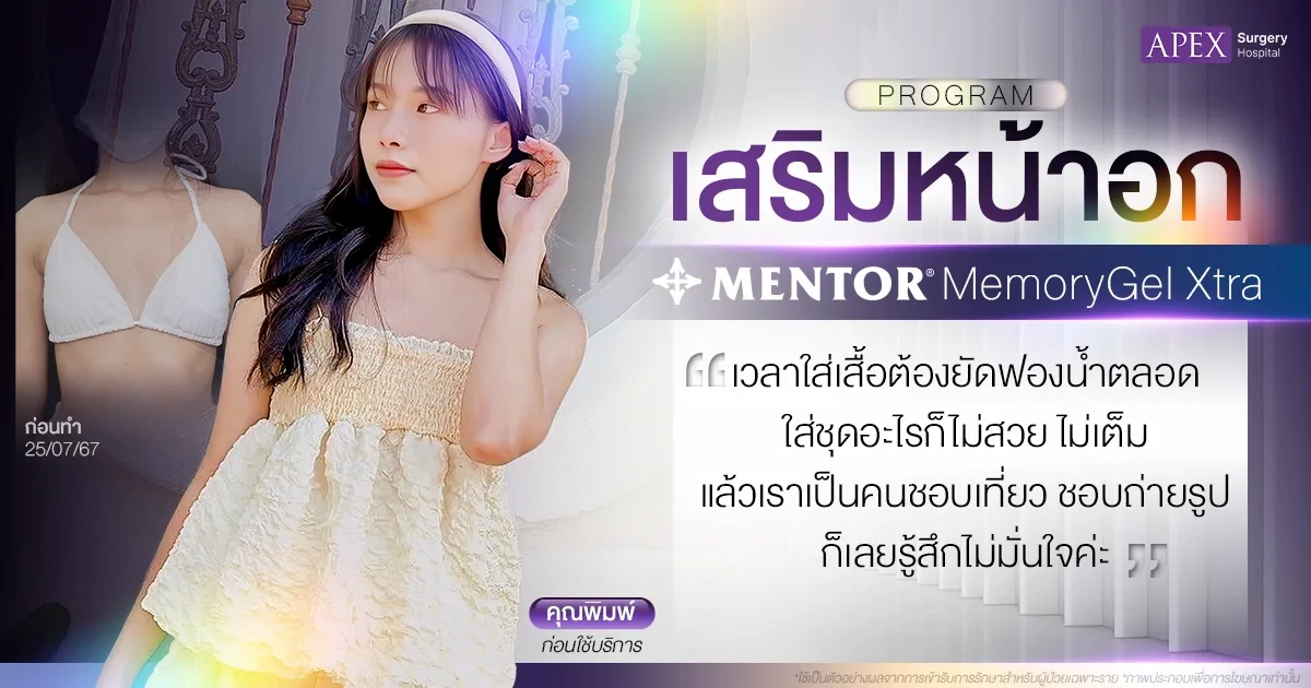 ปัญหาหน้าอกที่ไม่สมส่วน คืออุปสรรคสำคัญที่บั่นทอนความมั่นใจในการใช้ชีวิตและการแต่งตัวของคุณพิมพ์ จนนำมาสู่การตัดสินใจครั้งสำคัญเพื่อเสริมสร้างสรีระให้ลงตัว ซึ่งเธอเลือกไว้วางใจทีมแพทย์จากเอเพ็กซ์ วันนี้คุณพิมพ์จึงพร้อมเปิดประสบการณ์รีวิวเสริมหน้าอก Mentor MemoryGel Xtra เพื่อแบ่งปันผลลัพธ์ที่ได้และความรู้สึกหลังการใช้บริการ